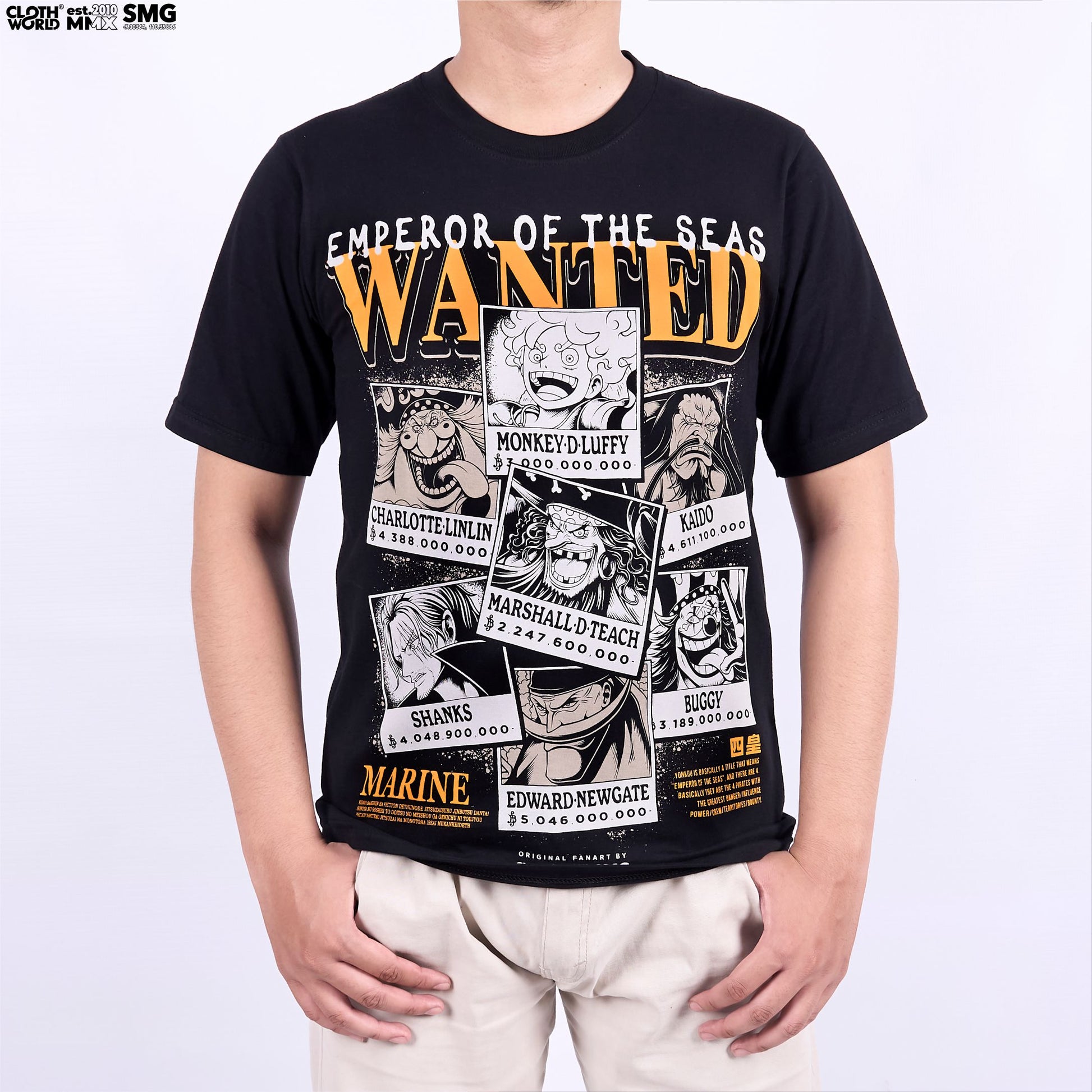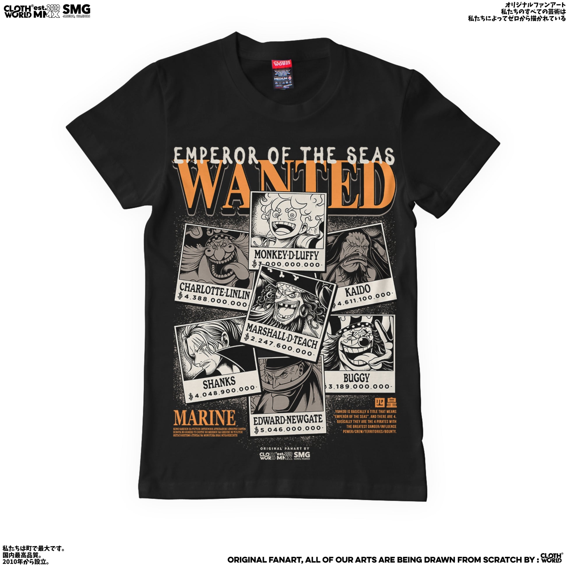 The Four Emperors. The most powerful pirates in the world. Own a piece of history with this iconic Yonkou Wanted Poster T-shirt. #OnePiece #Yonkou #BigMom #Kaido #Blackbeard #Shanks #Anime #Manga #GeekFashion #OtakuFashion #Tshirt #LimitedEdition #Clowor